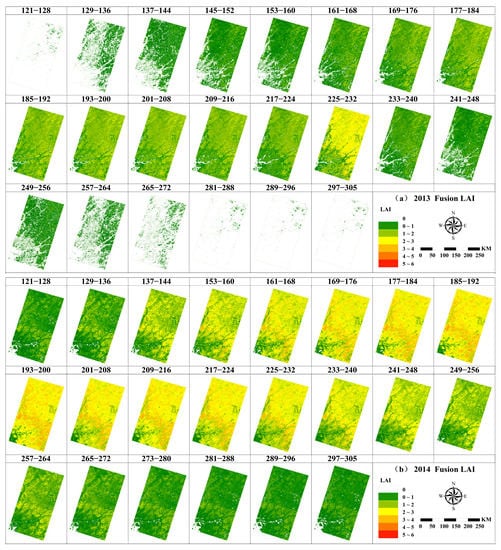 Based on the STARFM fusion model, forest stands vegetation growth period (from the 121st to the 305th day of each year) LAI long-term image series with a spatial resolution of 30 m and temporal resolutions of 8d in the study area from 2013 to 2017 were obtained. The details of the temporal and spatial distribution are shown in Figure 8.