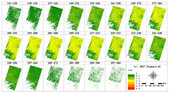 Further analysis of Figure 8 shows that the Spatiotemporal distribution of the fused LAI presented a typical seasonal variation, with lower LAI values in spring and autumn and higher LAI values in summer. During the growing season from May to October: in spring (May), DOY121–145, the LAI value gradually increased; in summer (June–August), DOY145–241, the LAI continued to grow and reached its peak, indicating that the peak period of vegetation growth occurred in during mid- and late July (193–208 days); in autumn (September–October), DOY 242–305, the LAI value decreased gradually. In summary, the fused LAI image was in line with the seasonal growth trend of plants.