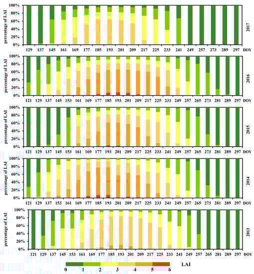 STARFM aims to generate 30 m spatial resolution and 8d LAI by fusing time-sparse Landsat8 OLI LAI and GF-1 WFV LAI images with collected high temporal resolution GLASS LAI images. Divide the LAI assimilated each year from 2013 to 2017 into six levels, and obtain the corresponding LAI histogram (Figure 9). The results show that the histogram of assimilated LAI also shows the same pattern. Specifically, during spring and winter, the majority of the LAI values were low, while during summer and early autumn, there was a significant increase in the proportion of high LAI values. In addition, the assimilated average LAI from 2013 to 2017 (Figure 5) is consistent with the changing trend in the LAI histogram corresponding to each year (Figure 9). This result suggests that the assimilated LAI effectively captures the spatial and temporal dynamics of forest vegetation LAI. In this study, it was successfully used to fuse the LAI product generated using the SA-BPNN model. By utilizing a method that searches for pixels with similar spectral characteristics within a moving window, the generated high spatiotemporal-resolution images successfully captured the temporal variation in the GLASS LAI time series while maintaining the high-resolution spatial details found in both the Landsat8 OLI LAI and GF-1 WFV LAI images.
