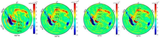 Based on Figure 11, it can be seen that by increasing the number of Kmax in the SCHA model, more detail in the radial components of the local gravity model emerges. However, by increasing the number of Kmax, yellow strips appear. The reason for an increase in the yellow strips primarily relates to the spatial resolution of the SCHA model and the overfitting problem. In our solution, the spatial resolution of two SCHA models with Kmax = 40 and 50 and capsize = are 166 km and 133 km, respectively, which are far away from the standard resolution of the GFO model. Therefore, we conclude that yellow strips are defined as fake signals. Moreover, the SCHA model provided realistic information about mass gain in the north of Antarctica, particularly across Dronning Maud Land and Enderby Land. These mass redistributions are insignificant in the L2 JPL result. Additionally, it revealed mass loss across Totten Glacier and Ninnis Glacier in East Antarctica and the Amundsen Sea Sector in West Antarctica [,]. These findings demonstrate the potential of the SCHA model to enhance our understanding of time-variable gravity fields over Antarctica.