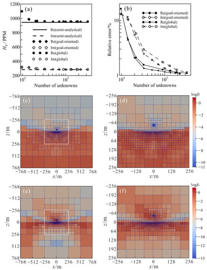 To verify the accuracy of the algorithm presented in this paper, we first assume a uniform half-space model and compare the forward responses calculated by our adaptive octree mesh with the semi-analytical solutions. We also compare the results from our goal-oriented adaptive algorithm and the globally adaptive one. The half-space has a resistivity of 10 Ω·m, the transmitting and receiving dipoles are both located in the air at the height of 45 m, and the offset between them is 8 m. The frequency is 25,000 Hz. Note that for convenience, we used the resistivity instead of the conductivity and the horizontal coplanar coil (HCP) system in all our numerical experiments. Figure 4 shows the globally adaptive mesh and that generated by the goal-oriented adaptive algorithm, the forward responses, and the relative errors with respect to the semi-analytical solutions. It is seen from Figure 4a,b that with an increasing number of elements, the forward results from the two adaptive algorithms converge quickly; the relative errors of the goal-oriented adaptive algorithm and the globally adaptive one both decrease rapidly. When the number of unknowns increases to a certain level, the relative errors tend to become stable. However, the comparison shows that the relative errors of our goal-oriented adaptive algorithm decrease faster than the globally adaptive one, meaning that when using the goal-oriented adaptive algorithm, one can obtain the same accuracy as the global adaptive algorithm with fewer elements and unknowns. Comparing the meshes in Figure 4c–f, one can clearly see that our goal-oriented adaptive scheme is more inclined to refine the elements in the underground near the transmitting and receiving dipoles than the global adaptive algorithm, so the goal-oriented adaptive algorithm presented here is more target-oriented in the process of mesh refinement.