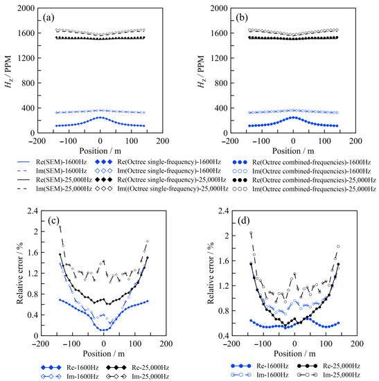 To further validate our algorithm for the modeling of multi-frequency and multi-receiver problems in AEM, we respectively calculate (1) Hz responses at 1600 Hz using the goal-oriented adaptive mesh generated for 1600 Hz; (2) Hz responses at 25,000 Hz using the goal-oriented adaptive mesh generated for 25,000 Hz; and (3) Hz responses at 1600 Hz and 25,000 Hz, with Hz calculated using the goal-oriented adaptive mesh created for the combined frequencies of 1600 Hz and 25,000 Hz. Then, we compare these results with those obtained from the fourth order of spectral-element method [16]. Figure 5 shows the model. The transmitting and receiving dipoles are both located at the height of 30 m with an offset of 10 m. The abnormal body has a size of 80 m × 80 m × 60 m and a top depth of 40 m. The resistivity of the half-space is 100 Ω·m, while the resistivity of the abnormal body is 1 Ω·m. Figure 6 shows the meshes with different adaptive refinement strategies, while Figure 7 shows the calculation results. It is seen from Figure 6a,b that at low frequencies, the EM system has a large penetration depth, and thus, a big range of adaptive mesh is generated so that both the abnormal body and the deep earth are refined. From Figure 6c,d, it is seen that at high frequencies, the EM system has a small penetration depth, so our adaptive method only refines the mesh close to the surface and the upper part of the abnormal body. From Figure 6e,f, it is seen that when the adaptive mesh is generated by considering two frequencies together, the surface and abnormal body are both well-refined. This implies that the mesh generated by combining the high and low frequencies takes care of both the shallow and deep earth. From the model results shown in Figure 7a,b, one sees that the forward responses using the single-frequency adaptive octree mesh and the octree mesh from combined frequencies are in good agreement with those of the fourth order of SE method, as the maximum relative errors of results calculated by the single-frequency meshes and the mesh of combined frequencies are both less than 2.2% (Figure 7c,d). This indicates that our adaptive algorithm is effective in dealing with the multi-frequency and multi-receiver AEM modeling problem.