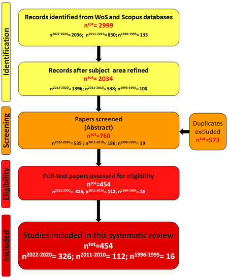 PRISMA flow chart showing the different steps of the dataset creation, where ntot was the total number of papers; n2022–2020 was the number of papers that were published in 2022, 2021, and 2020; n2011–2010 was the number of papers that were published in 2011 and 2010; n1996–1995 was the number of papers that were published in 1996 and 1995.