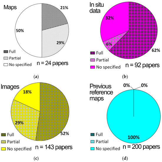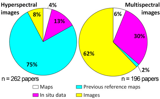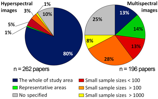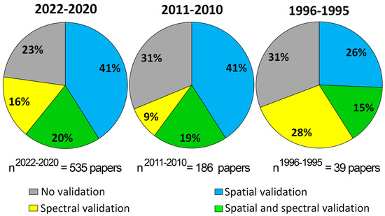 Considering all papers that performed spatial validation (blue and green wedges in Figure 2), the percentage of these research published in 2022, 2021, and 2020 (61% of a total of 326 papers) was comparable to that of the papers that were published in 2011 and 2010 (60% of a total of 112 papers), whereas these percentages were greater than those of the papers that were published in 1996 and 1995 (41% of a total of 16 papers). Moreover, the percentage of the research published in 2022, 2021, and 2020 that did not validate the results (23%) was smaller than those of the papers that were published in the other 2 groups of years (31%). In conclusion, these values highlighted not only the increasing application of spectral unmixing over these years, but also the high priority given to the spatial validation.