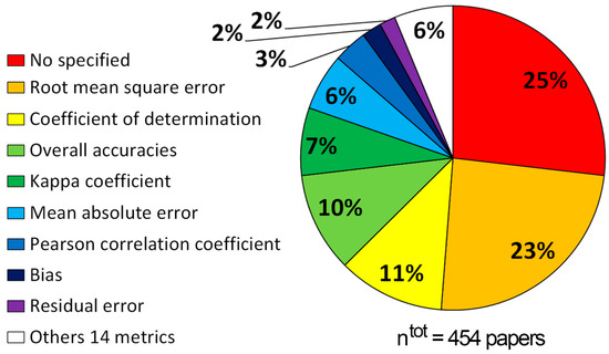 The screening carried out showed that the number of studies that spatially validated the results of spectral unmixing has significantly increased over the selected years (bright red box in Figure 1): about 100 research papers per year were published in the past 3 years; about 50 research papers per year were published in 2011 and 2010; about 10 research papers per year were published in 1996 and 1995. The screening carried out showed also that the number of studies that applied spectral unmixing has significantly increased over the selected years (orange box in Figure 1): about 180 research papers per year were published in the past 3 years; about 90 research papers per year were published in 2011 and 2010; about 20 research papers per year were published in 1996 and 1995. In order to assess the importance of spatial validation in the spectral unmixing procedure, the papers that applied spectral unmixing to remote imaging were analyzed (orange box in Figure 1). Figure 2 shows the percentage of these papers that were not validated (the percentage in grey wedges), spectrally validated (the percentage in yellow wedges), spatially validated (the percentage in blue wedges), and spatially and spectrally validated (the percentage in green wedges) the spectral unmixing results. Therefore, spatial validation was carried out alone (blue wedges in Figure 2) or together with spectral validation (green wedges in Figure 2).