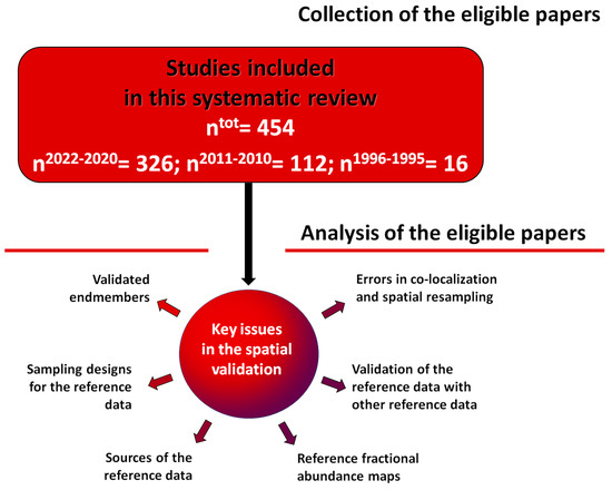 Reading the full text of the screened papers was conducted to identify only those that spatially validated the spectral unmixing results (bright red box in Figure 1). The last analysis identified the eligible papers: 326 were the papers published in 2022, 2021, and 2020; 112 were the papers published in 2011 and 2010; 16 were the papers published in 1996 and 1995.