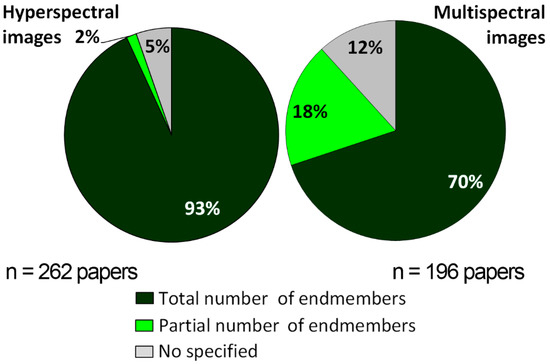 A pixel that contains more than one “land-cover type” is defined as a mixed pixel, and its spectrum is formed by combining the spectral signatures of these “land-cover types” [1]. The presence of mixed pixels in the image constrains the techniques that can be carried out to analyze, characterize, and classify the remote sensing images [2,3]. To retrieve mixed-pixel information from remote sensing images, a shared research effort allowed developing several methods (e.g., spectral unmixing, probabilistic, geometric-optical, stochastic geometric, and fuzzy models [1]). However, the literature shows that, for over 40 years, spectral unmixing has been the most commonly used method for discrimination, detection, and classification of superficial materials [4,5,6].