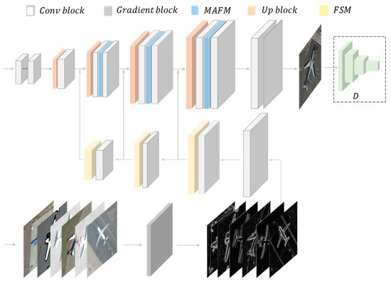 In order to improve the performance of the model in remote sensing images, this paper introduces the multidimensional self-attentive feature selection module (MAFM in Figure 1) into the generator network. Additionally, this paper uses the gradient structure information to guide the model to generate more realistic sample images.