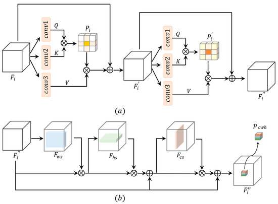 However, it is difficult to capture the relationship between feature maps; therefore, in order to learn the long-distance dependencies within the channel dimension of the feature maps, is passed sequentially through the spatial attention module and the channel attention module. The feature attention selection module shown in Figure 2b is added after Figure 2a to model the importance and interdependence of the feature maps in three dimensions: two in the spatial domain and one in the channel domain. and are the spatial attention maps and is the channel attention map, which are obtained in the same way, the only difference being that the dimensions are different.