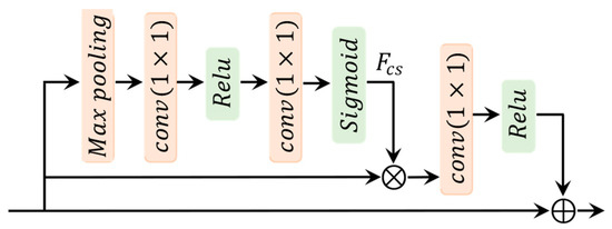 As shown in Figure 3, taking channel attention as an example, F is first reduced to a one-dimensional vector along the channel dimension, using the maximum pooling operation. Then, the importance of each channel feature map is obtained by a 1 × 1 convolutional layer, ReLU activation function, 1 × 1 convolutional layer, and sigmoid activation function in turn. Subsequent to multiplying the features after the spatial attention module, they are summed with after the 1 × 1 convolutional layer and ReLU activation function in turn to obtain the final output feature . contains not only the long-range dependencies of all spatial locations within the whole spatial dimension but also the correlations between channel dimensions and the importance of each feature map under that dimension, which enables the generator to better use the global information to generate high-quality remote sensing images.