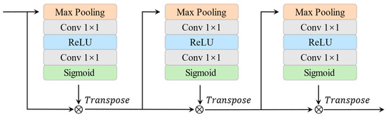 After obtaining the gradient map, it is first fed into the first convolutional block to extract simple structural features, which consists of a 3 × 3 convolutional layer with a step size of 1 and an instance normalization layer. It is then fed into three modules consisting of a convolution block and a multidimensional feature selection module (FSM) in turn to further extract structural features. The convolutional block consists of three dense residual blocks, each consisting of five 3 × 3 convolutional layers using dense connections and the Leaky-ReLU activation function. The specific structure of the multidimensional feature selection module (FSM) is shown in Figure 5, which uses transposition operations to select features from three dimensions, namely the spatial dimension W, spatial dimension H, and channel dimension C, respectively. Each feature selection module consists of a maximum pooling layer, a 1 × 1 convolutional layer, a ReLU activation function, a 1 × 1 convolutional layer, and a sigmoid activation function.
