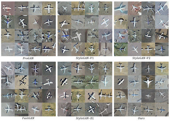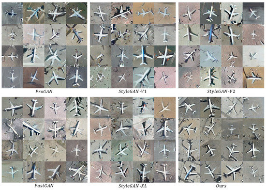 The qualitative evaluation of the results of the different algorithms on the DOTA dataset is shown in Figure 6. The remote sensing sample images generated by ProGAN and StyleGANv1 were more seriously distorted, and the partial structures of the wings of some planes in the images were severely distorted. The StyleGANv2, FastGAN, and StyleGAN-XL methods generated a few clearer sample images, but there was also distortion in the partial structures of the wings and tails. In contrast, the method proposed in this paper generated sample images with realistic visual effects, and the image structure was more realistic and reliable.