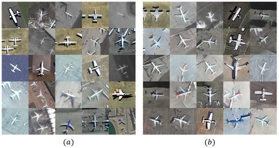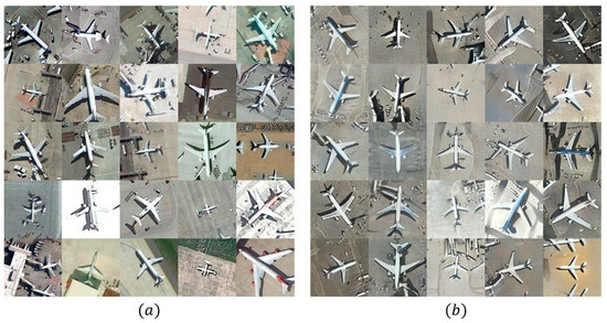 Adding single-class targets to multi-class target data: The DOTA airborne remote sensing dataset contains 15 common object classes. The number of plane targets is significantly lower than that of ships and vehicles, and the plane targets are of different sizes. We added 1000 samples of plane targets of different sizes generated by the method in this paper to the training set of the original dataset, as shown in Figure 8; the left subfigure (a) shows the image slices of the original dataset, and the right subfigure (b) shows the added generated data to compare the experimental results of object detection.