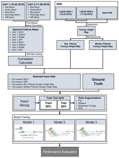 To analyze the effect of learning the model by reducing the tree position error component of the image, three modified U-Net models were produced and trained using preprocessed data. Subsequently, a quantitative performance evaluation was conducted using the test dataset. Figure 2 shows the detailed workflow of this study, which can be largely divided into three parts: (1) data preprocessing, (2) patch slicing and data augmentation, and (3) model training and performance comparison analysis.