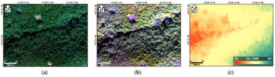 Optic and LiDAR data used in the study: (a) true color (R, G, B) composite image, (b) false color (red edge, NIR, B) composite image, and (c) LiDAR DSM acquired in October; (d) true color (R, G, B) composite image, (e) false color (red edge, NIR, B) composite image, and (f) LiDAR DSM acquired in November; (g) DTM provided by NGII.