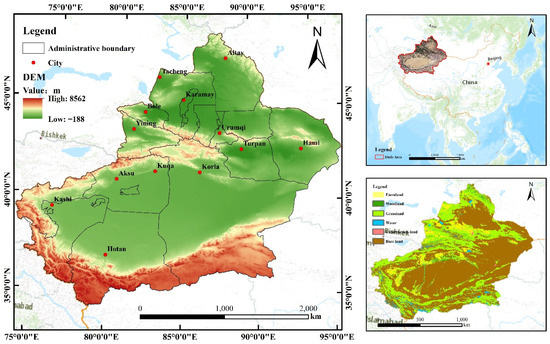Xinjiang is located in the northwestern part of China, the hinterland of the Eurasian continent. It lies between 73°40′E and 96°18′E longitudes and 34°25′N and 48°10′N latitudes (Figure 1). It is the largest province with longest land boundary in China, with an area of approximately 1.66 × 106 km2, accounting for about one-sixth of the entire country’s area. It has a unique topography of “three mountains and two basins”, and also has the country’s largest mobile desert and semi-fixed desert under a typical temperate continental climate [34]. Precipitation distribution is extremely uneven, with limited vegetation coverage and development land, as well as low utilization efficiency. Xinjiang has limited water resources as well, and most of the urban development is dependent on the oasis, forming a unique oasis urban ecology. However, urban development is severely restricted due to the fragile oasis ecological environment. A large population and human activities are mainly concentrated in the oasis, leading to a conflict between man and the environment that is more obvious compared to that seen in other regions of China. Unsurprisingly, protecting the region’s ecological security is becoming a very urgent task in this area.