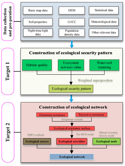 Ecological security is emerging as a new research area that focuses on ensuring the sustainable development of Chinese society. The environment has been severely harmed over the past few decades as a result of intensifying human activity, as well as the expansion of the urban area, agricultural land, and transportation network. This has led to a number of ecological problems [1,2,3,4]. The construction of an ecological network is a key strategy to ensure regional ecological security. The level of ecological security and the quality of the ecological environment can be effectively improved by constructing ecological networks to accomplish the efficient management of regional ecological environments, and to adjust the resilience and risk resistance of ecological environments [5].
