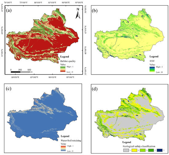 The ecological security pattern in Xinjiang ((a) habitat quality; (b) ecosystem services value; (c) water-soil retaining; (d) ecological safety classification). Note: 1 indicates ecological marginal area; 2 indicates ecological transition zone; 3 indicates ecological connection zone; 4 indicates ecological buffer zone; 5 indicates ecological core area.