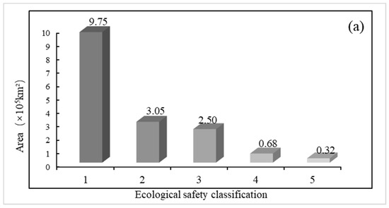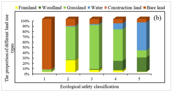 The statistics of ecological safety classification. ((a) Area occupied by different levels of ecological security; (b) The proportion of land use types in different ecological security levels).