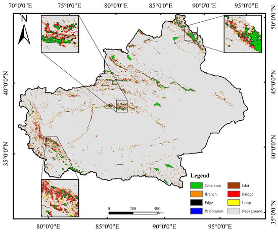 In this study, the ecological core area and the ecological buffer zone are used as foreground data, and the remaining areas are used as background areas for the MSPA (Figure 5). Table 7 shows the statistical results of the area and the proportion of each landscape.