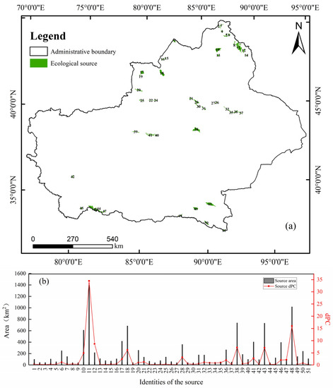 On the basis of MSPA, by taking the connectivity of the landscape and its effective value into account, an area greater than 10 km2 and with a dPC value in the top 20% was selected as the ecological source. A total of 51 sources were screened out with a total area of 1.08 × 104 km2. The area is composed of forest land and water bodies (Figure 6).