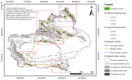 The construction of an ecological network reduces the difficulty of ecological governance and restoration. By controlling key ecological sources, corridors, and key nodes, the objects of ecological protection are more targeted, and the scientific nature of ecological management and control is enhanced. It involves an expansion and optimization of the existing ecological safety management in the region, which helps to promote the sustainable ecological development of Xinjiang more effectively. The conclusions of this study are as follows: