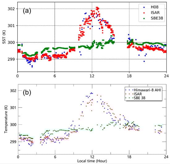 A case study to evaluate the three SST datasets, i.e., Bureau H8 L2P, ISAR skin, and SBE38 depth SST measurements, is undertaken during a strong diurnal variation (DV) event that occurred on 12 October 2016 near the north-eastern Australian coast (~146°E, 18°S) []. Part of the motivation for this case study is to compare with the study by [], who also studied this DV event using the same data sets, except that their H8 SST retrievals are sourced from JAXA. The time series of the SSTs for this date are shown in Figure 2. First, it is encouraging to see that the Bureau H8 SSTs follow the ISAR skin SSTs very closely for the whole day (Figure 2a). Similar to the JAXA product (Figure 2b), the Bureau H8 SSTs also capture the DV amplitude well (Figure 2a). Since both studies use the same data source for ISAR and SBE38 SSTs, their time series (red and green dots) should be theoretically identical in both panels, respectively. However, in order to retain the full data set and show the DV cycle with more detail, we do not apply any QC on the data sets for this particular case study, hence the slight differences, such as the gaps at different hours, observed in the red and green dots in the two panels, respectively. The inconsistency could also be partially due to the different availabilities of the two satellite SST data sets during collocation as their retrieval algorithms and collocation methods differ. Furthermore, it is noticed that in both panels, for LST before 10 h and after 18 h, the SBE38 depth SSTs (green dots) are usually warmer than the ISAR and H8 SSTs by a few tenths of a degree, which can be a good indicator of the cool skin effect. The largest difference between SBE38 and ISAR skin SST reaches a maximum of ~0.4–0.5 °C at around local sunrise (~5–7 LST), which is consistent with the findings in [].
