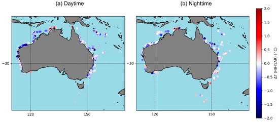 Locations of the final QC’d matchups for (a) daytime and (b) night-time in this study. The colour of the dot represents the temperature difference ΔT (H8-ISAR).