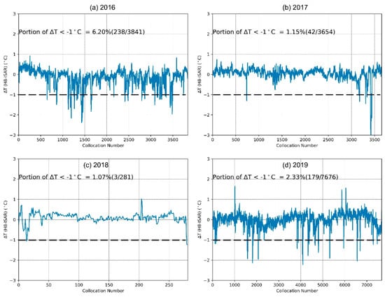 Time series of night-time ΔT (H8-ISAR) for each year (panel (a) for 2016; (b) for 2017; (c) for 2018 and (d) for 2019; 2020 not shown here, as there is only 1 matchup), with the portion of cold satellite outliers (ΔT < 1 °C) indicated. The dashed black lines are reference lines at ΔT = −1 °C in each panel.