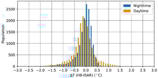 The distributions of daytime and night-time ΔTs (H8-ISAR) are shown in Figure 5. Most daytime ΔTs sit within the −0.2 °C to −0.1 °C range, corresponding to the negative mean bias (−0.12 °C), whereas the peak for the night-time ΔT distribution is seen at the 0–0.1 °C bin. As expected, daytime ΔTs have more outliers in both cold and warm tails than night-time data, hence the larger SD as observed in Table 2. There are few night-time ΔTs > 1 °C outliers but the daytime population at this warm tail is still noticeably large.