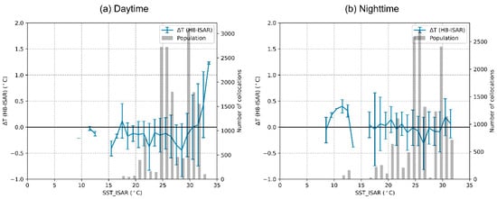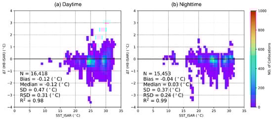 Density distributions of daytime and night-time ΔTs (H8-ISAR) are further analysed against ISAR SST conditions (Figure 6). For both daytime (Figure 6a) and night-time (Figure 6b), most of the matchups are obtained under SST conditions between 15 °C and 32 °C, especially within the 25 ± 2 °C and 30 ± 2 °C ranges. More collocations for SST < 15 °C conditions are observed at night-time than in the daytime. There are significantly more warm outliers (ΔT > 1 °C) in daytime than in the night-time, as also shown in Figure 5.