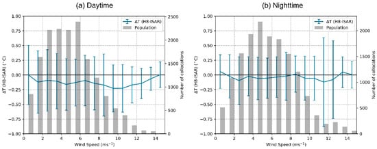 Evaluation of (a) daytime and (b) night-time ΔTs (H8-ISAR) under different wind speed conditions. The blue line represents the mean bias within each 1 ms−1 wind speed bin and the error bar is the SD of the biases within that bin. The number of collocations within each bin is indicated by the grey bar.