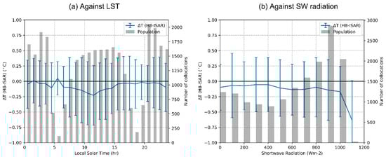 Combining the daytime and night-time data together, we now validate H8 SSTs against local solar hours. In Figure 9a, most of the mean biases, ΔTs, are slightly negative (−0.05 °C to −0.20 °C) in the daytime but are much closer to 0 °C in the twilight and night-times. The underestimation of H8 SSTs exists consistently in the daytime, with a noticeable dip in mean ΔT at around −0.22 °C (Figure 9a). Given that the shortwave radiation is typically highest around 12 h LST, one is naturally intrigued to see if there is any correlation between ΔT and the shortwave flux. We plot the daytime ΔTs against solar shortwave radiation in Figure 9b. It is noticed that when the matchups are abundant (shortwave radiation < 1100 Wm−2), there is no discernible dependency of ΔT on shortwave radiation.