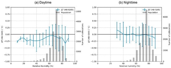 Water vapor existing in the atmosphere is known to pose challenges for accurate satellite SST retrieval in the IR spectrum band []. The dependence of ΔT on relative humidity (RH) is examined to evaluate the performance of Bureau fv02 H8 L2P SST retrievals. As shown in both panels in Figure 10, the most common RH values range from 40% to 90%, peaking at 70–75% in the daytime (Figure 10a) and at 75–80% in the night-time (Figure 10b). In the daytime, when RH is <60%, H8 tends to underestimate water temperatures by −0.25 °C to −0.05 °C. When RH is >60%, the absolute values of the negative biases decrease, with also significantly larger matchup sizes (Figure 10a). During the night, most of the mean ΔTs are very close to the zero line (Figure 10b). The jumps at both ends should again be due to the small matchup sizes.
