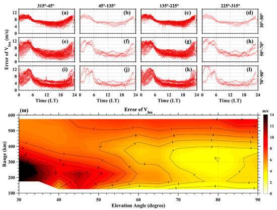(a–l) the local time distribution of error of LOS velocity at 300 km altitude four under different azimuth angle bins from left to right panels and three different elevation angle bins from top to bottom panels; (m) the distribution of errors of LOS velocity with elevation angle and range during 12:00 LT to 15:00 LT.