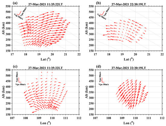 It follows, then, that , and are very close to , and while has a nonnegligible difference with . This is because of a very small magnetic declination angle (~−1.9°) but a nonnegligible magnetic inclination angle (~26°). The result of applying this method to the experiment on 27 March 2021 is shown in Figure 4. Figure 4a,b show the and in meridional plane at daytime 11:35 LT and nighttime 22:30 LT. The gray dashed line shows the magnetic field lines. Plasma velocity shows the perpendicular magnetic field northward and parallel magnetic field poleward at 11:35 LT at the altitude of 200–500 km, and almost along the magnetic field towards the equator at 22:30 LT at 250–450 km. These results are consistent with the result of and in Figure 3c,e. Figure 4c,d show the and in the zonal plane during daytime and nighttime. At 11:35 LT, plasma velocity shows strong perpendicular magnetic field westward at the altitude of 100 to 500 km which is consistent with the result of shown in Figure 3a. Plasma shows the obvious perpendicular magnetic field northward at the altitude of 200 to 300 km but the perpendicular magnetic field southward above 300 km which is different from the result of shown in Figure 3b. At 22:30 LT, shows a strong perpendicular magnetic field eastward component which is consistent with the result of shown in Figure 3a, but shows perpendicular magnetic field northward which is inconsistent with the of almost 0 m/s at that time in Figure 3b. That is what Equations (12)–(16) tells. In meridional plane, the difference between and is about , which might be 1.5 m/s or −1.5 m/s assuming that is 100 m/s at daytime or −100 m/s at nighttime. Similarly, the difference between and will be about −3 m/s or 3 m/s at daytime or nighttime. This is a tiny difference compared to its own value of or . In the zonal plane, the difference between and is also small. However, the difference between and is about 43.8 m/s or −43.8 m/s with the assumption of 100 m/s or −100 m/s of . This caused an obviously decreased and increased difference between and at daytime and nighttime, respectively, which could not be ignored.