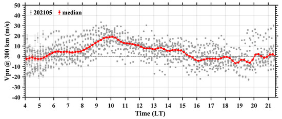 With the above example, we find that the accurate three components of plasma drift velocities can be obtained with NS + EW scanning beams, or relatively reliable two components of and can be obtained with NS scanning beams, but with only EW scanning beams, the estimated are very different from the actual . Therefore, it is not recommended to use only EW scanning beams for plasma drift detection; instead, the beams can be performed scanning in the meridian (NS) and cross-shaped (NS + EW) planes to obtain the spatial distribution of the plasma drift. The detection modes used during 11–28 May were all the same as NS scanning beams. In Figure 5, the variation of with local time (04:00 LT–21:30 LT) of 300 km altitude is shown as gray dots, while the median value of is calculated and plotted together in this figure as red dots. shows a clear day-to-day variation and will be distributed in a speed range with a difference of about 40 m/s at the same local time. However, shows a similar trend during these days, as presented by the median values: the velocity approaches 0 m/s or shows negative values during the night, turns positive at sunrise (around 05:30 LT), and continues to increase, reaching a maximum value of about 20 m/s before noon (around 10:00 LT), then decreases slightly in the afternoon but remains positive, and gradually decreases to <0 m/s around evening with no significant PRE at sunset, showing a negative value for most of the nighttime. The solar flux in May 2021 was at a low level (averaged value of f107:79) and geomagnetic conditions were quiet (Kp ≤ 3 for 93% period time). These results are consistent with Jicamarca’s previous observations [16,22].