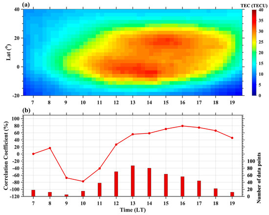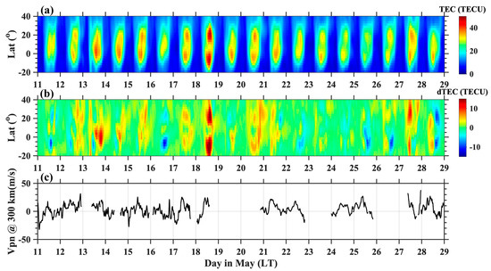 To discuss the reliability of the plasma drift inversed by SYISR’s observations in scientific studies, we give two examples as follows. The first one is the statistical correlation of the with the crest-to-trough ratio (CTR) of EIA for total electron content (TEC) in May. The EIA is formed mainly from the removal of plasma around the geomagnetic equator, creating the trough above the equator, and consequently, the two crests off the equator at an altitude in both northern and southern hemispheres, which is influenced by chemistry, neutral wind, E × B drift and ambipolar diffusion. The EIA varies with time of day, season and level of solar activity, and has large day-to-day variability mainly due to the variability of E × B drift [23]. With the evolution and enhancement of EIA, density above the trough would decrease and densities at crests would increase. When the E × B drift is stronger, the density above the trough is smaller. To characterize the EIA variations, CTR is usually used to represent EIA strength, which is mainly linked with the zonal electric field and used to study the occurrence of irregularities and scintillation [24]. The product of a 15 min global ionospheric TEC map (GIM) has been used [25]. Figure 6a shows an overview of the local time variation of EIA in the longitude of 110°E, Figure 6b shows the TEC differences with its median value, and Figure 6c shows the at the altitude of 300 km. In detail, the monthly median pattern of EIA is shown in Figure 7a. The variation of the correlation coefficient of crest-to-trough ratio (CTR) and from 07:00 LT–19:00 LT is shown in Figure 7b. CTR is calculated by employing the same equation of Xiong et al. [26] represented by (N+S)/2T, where N(S) represents the TEC above the northern (southern) crest and T represents the TEC at the trough. The red rectangle indicates the number of data pairs for which this correlation coefficient is calculated. The correlation coefficient is close to 0 at 07:00 LT, basically negative in the morning hours, gradually reversing to positive at noon, and maintaining a relatively high positive correlation after 14:00 LT. The observed data pairs are less than 20 at 07:00 LT–10:00 LT and 19:00 LT, which may have the effect of small samples with unstable statistical results. The negative correlation coefficient before noon could most probably be caused by the asymmetry of the EIA modulated by the meridional wind in May in the morning-noon sector. Due to the summer-to-winter trans-equatorial wind, the northern crest of EIA is much less developed and the southern crest is enhanced. There is no obvious double-crest of EIA in May before 12:00 LT, although there is large in the morning–noon sector shown in Figure 5. The high correlation coefficient between and CTR after 14:00 LT indicates that is a key parameter that affects the evolution of EIA and can be used in the study of middle-low latitude ionospheric parameters of short-term forecasting and day-to-day variability.