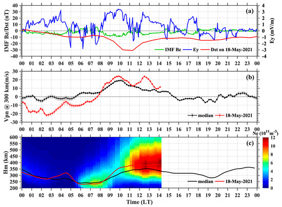 (a) The local time variation of Ey (blue), IMF Bz (green) and Dst (red) index on 18 May, (b) the local time variation of at 300 km altitude on 18 May (red) as well as its median value (black), (c) the distribution of the peak electron density height derived from SYISR electron density profile on 18 May (red) as well as its median value (black). The absence of and electron density after ~14:10 LT on 18 May because of the experiment interruption.