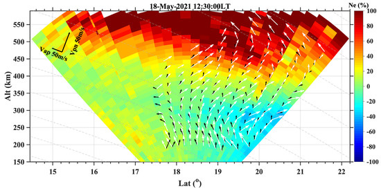 The second is the application of the inverse drift with a latitude–altitude spatial distribution in the study of the ionospheric storm. Figure 8a shows the variation of interplanetary magnetic field (IMF) Bz component in GSM coordinates obtained from OMNI database, the dawn–dusk component of interplanetary electric field Ey, Dst index. Figure 8b shows the local time variation of at 300 km altitude on 18 May as well as its monthly median value. Figure 8c shows the distribution of the peak electron density height (Hm) derived from the SYISR electron density profile on 18 May as well as its monthly median value. As shown in Figure 8a, a minor geomagnetic storm occurred on 18 May with Dst minimum of −31 nT. IMF Bz experienced two southward excursions at 08:00 LT and 11:30 LT as well as the enhancements of Ey at the same time, corresponding to two enhancements of at 300 km altitude with magnitudes of 5–15 m/s in Figure 8b. After 08:30 LT, Hm lifts rapidly from 264 km to 383 km, then drops slightly to 378 km, but lifts again to 386 km after 12:30 LT in Figure 8c. Because of the experiment interruption, and electron density after ~14:10 LT on 18 May are absent. Both the interplanetary parameters and as well as Hm indicate that there were eastward penetrating electric fields taking effect during this period in the East Asia region. Figure 9 shows the distribution of relative electron density and plasma drift (white arrows) in the meridional plane at 12:30 LT on 18 May, with black arrows marking the monthly averaged plasma drift pattern and gray dashed lines showing the magnetic lines. For the average pattern of drift at 12:30 LT, the velocities in the meridional plane show basically northward perpendicular to the magnetic field lines, with no apparent velocities along the equatorward or poleward along the magnetic field lines. In comparison, drifts on 18 May show a significant increase in the velocities northward perpendicular to the magnetic field lines and poleward along the magnetic field lines below 500 km where the errors are within the acceptable range, which contributes to the significant increase (80–100%) in electron density at high altitudes over the latitudes 15–22°. The TEC over the whole EIA region was greatly intensified during this period as illustrated in Figure 6a, which is associated with an electrodynamic process due to the penetration electric field. More physical mechanisms will be discussed in subsequent scientific study, but this unique spatial distribution of plasma drift velocities at low latitude provides rich and fine information on the geomagnetic storm effect, which facilitates the study of the ionospheric response at smaller scales and helps to understand the magnetosphere–ionospheric coupling processes.