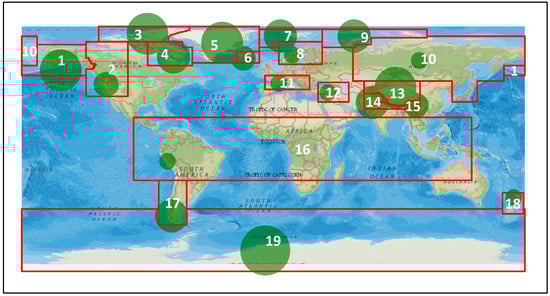 Global distribution of glaciers. The diameter of circles is proportional to the total glacier area shows the area covered. Number refers to the RGI (Randolph Glacier Inventory 6.0). Region names: 1: Alaska, 2: Western Canada and US, 3: Arctic Canada North, 4: Arctic Canada South, 5: Greenland, 6: Iceland, 7: Svalbard, 8: Scandinavia, 9: Russian Arctic, 10: North Asia, 11: Central Europe, 12: Caucasus and Middle East, 13: Central Asia, 14: South Asia West, 15: South Asia East, 16: Low Latitudes, 17: Southern Andes, 18: New Zealand, 19: Antarctic and Subantarctic. Base map National Geographic World Map from ESRI, Garmin, HERE, UNEP-WCMC, USGS, NASA, ESA, METI, NRCAN, GEBCO, NOAA, Increment P corp.