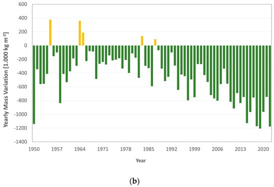 It is well known that glaciers (Figure 2) are sensitive sentinels of climate change. The progressive retreat of ice cover confirms the current trend of increasing global average temperature and the fragility of the ecosystem we are living in. For instance, most Alpine glaciers are expected to disappear by 2100, inducing negative implications on natural ecosystems and water resources management. The annual mass balance of glaciers is an important indicator of climate change, reflecting changes in temperature and precipitation patterns [11]. A glacier with a negative mass balance (mass loss is higher than mass gain) is an evident alert that the glacier is shrinking and that it may eventually disappear (Figure 3). In addition, the monitoring of other aspects, including distribution, velocity, temperature and structure, is crucial to understand the impact of glacier reduction on hydrological processes, the related hazard assessment and for developing appropriate strategies of mitigation.