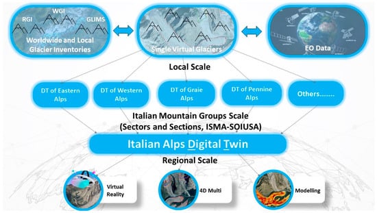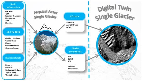 Elements that act as building blocks for the definition of the DT for a single glacier are reported in Figure 5 and described in the next sections.