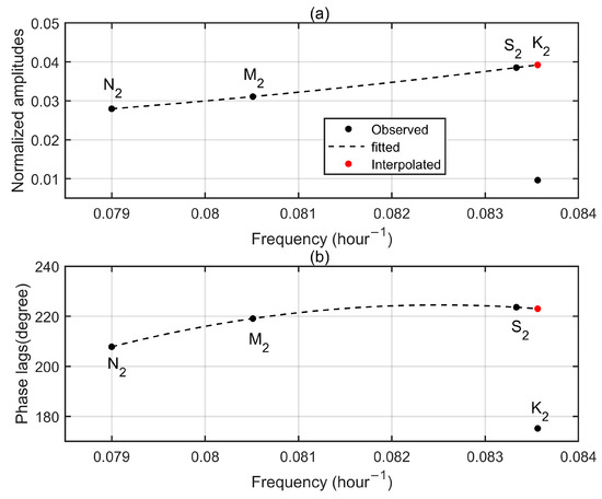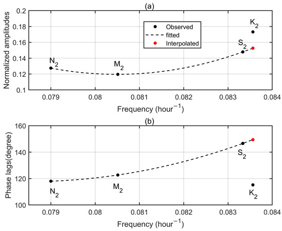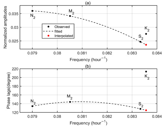 A (w) represents tidal admittances while w is tidal frequency. Model parameters a1, a2, a3 can be determined via least squares. Tidal admittances for amplitudes (i.e., normalized amplitudes) are defined by the ratios of observed tidal amplitudes to theoretical equilibrium tidal amplitudes, while tidal admittances for phases are defined by the phase lags between observed tidal phases and theoretical equilibrium tidal phases. Note that equilibrium tidal amplitudes can be calculated based on the equilibrium tide theory via the s_equilibrium_tide function in the S_TIDE toolbox developed by the authors [15,16,17], while phase lags can be directly estimated from observations using tidal harmonic analysis. Tidal admittances represent actual tidal responses of ocean environment to the astronomical forcing, which mainly depend on the frequencies of tidal waves, water depth and coastlines. For tides in specific sea areas, tidal admittances only depend on tidal frequencies because the ocean environment is the same for all kinds of tidal waves. Semi-diurnal tides have similar tidal periods (close to 0.5 days), which means that their wave lengths are also similar. As a result, tidal responses for semi-diurnal tides are highly consistent; namely, their co-tidal charts are closely similar in terms of spatial patterns (see Figure A1 in the Appendix A). Therefore, tidal admittances for semi-diurnal tides can be approximated by the smooth functions of tidal frequencies. Diurnal tides also have similar features.