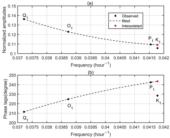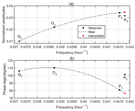 Diurnal tidal admittances for the north component at Aira GPS station. (a) Normalized amplitudes. (b) Phase lags. Observed tidal admittances are denoted by black dots while dash lines mean the fitted curves. Red dots represent the interpolated values according to the fitted curves.