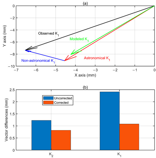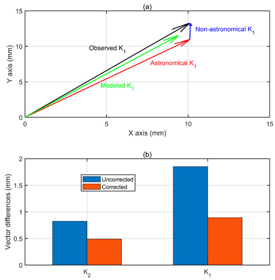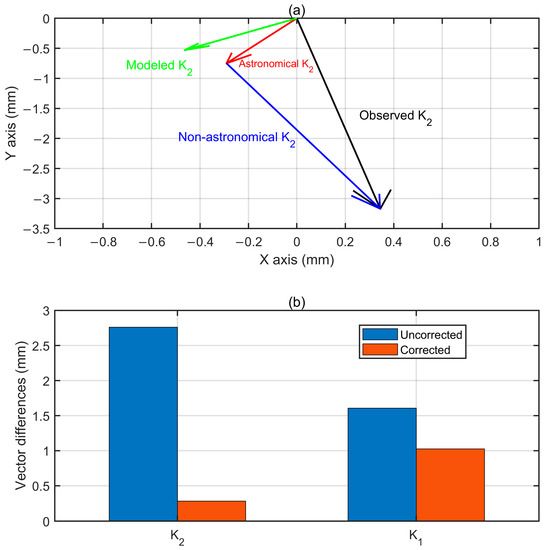 (a) The vectorial composition of the astronomical K1 tide (red arrow) and non-astronomical K1 tide (blue arrow) furnishes the observed K1 tide (black arrow) at Aira. Green arrow represents the modeled K1 tidal vector (using FES2014 tidal model). (b) The vector differences (VDs) between modeled K1/K2 tidal vectors and uncorrected/corrected K1/K2 tidal vectors (corrections are performed on the basis of the credo of smoothness).