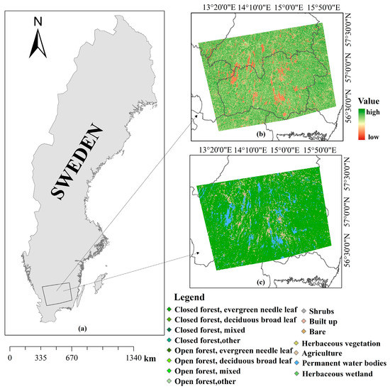 Location of study area. (a) The location of the study area in Sweden; (b) vegetation continuous fields (VCFs) in the study area, and (c) CGLS-LC100 Collection 3 2016 land cover data of the study area.