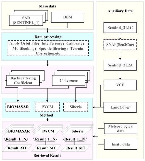 General experimental procedure. The yellow part is the data, the blue part is the SAR processing and model processing, and the pink part is the result of each step.