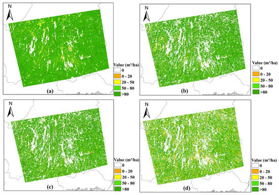 Ecological issues are currently being investigated by almost all countries around the world [1,2,3]. Among these ecological issues, forests are an important research target because they play a vital role in regulating the ecological climate and are the primary means of carbon uptake [4,5,6]. The forest growing stock volume (GSV) is a critical parameter of a forest and is generally related to the forest economy and sustainable development [6,7]. The forest GSV refers to the total volume of standing trees in the forest per unit area, and the unit is usually cubic meters per hectare (m3/ha). Usually, GSV is measured in the field by manually collecting the breast diameter and tree height of the trees in a sample plot and then calculating an allometric equation or checking a height–breast diameter–volume table to estimate the GSV [8]. The manual field measurement method is time-consuming and labor-intensive, with long renewal cycles and limited working areas making it challenging to widely use.