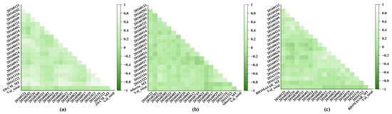 The correlation heat map of the results. Model name_MT is the result of multiple time series. Vol_total represents the measured value. (a) The correlation of IWCM; (b) the correlation of Siberia model; (c) the correlation of BIOMASAR. The lighter the color, the stronger the correlation.